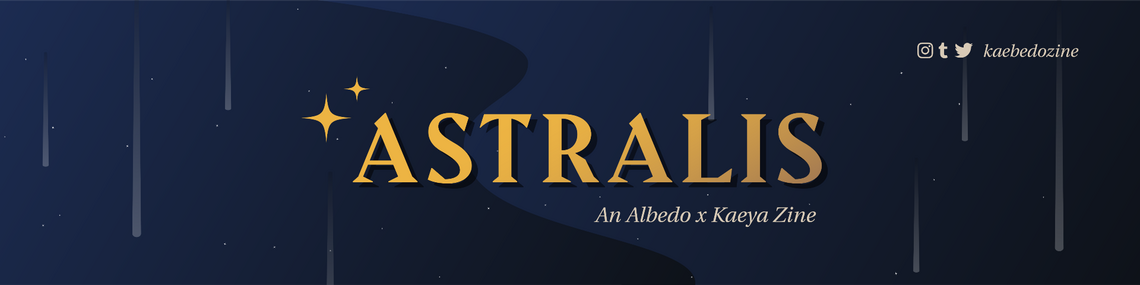 Astralis is a physical, for profit and SFW fanzine centered on the relationship between Chief Alchemist Albedo and Calvary Captain of the Knights of Favonius Kaeya Alberich.